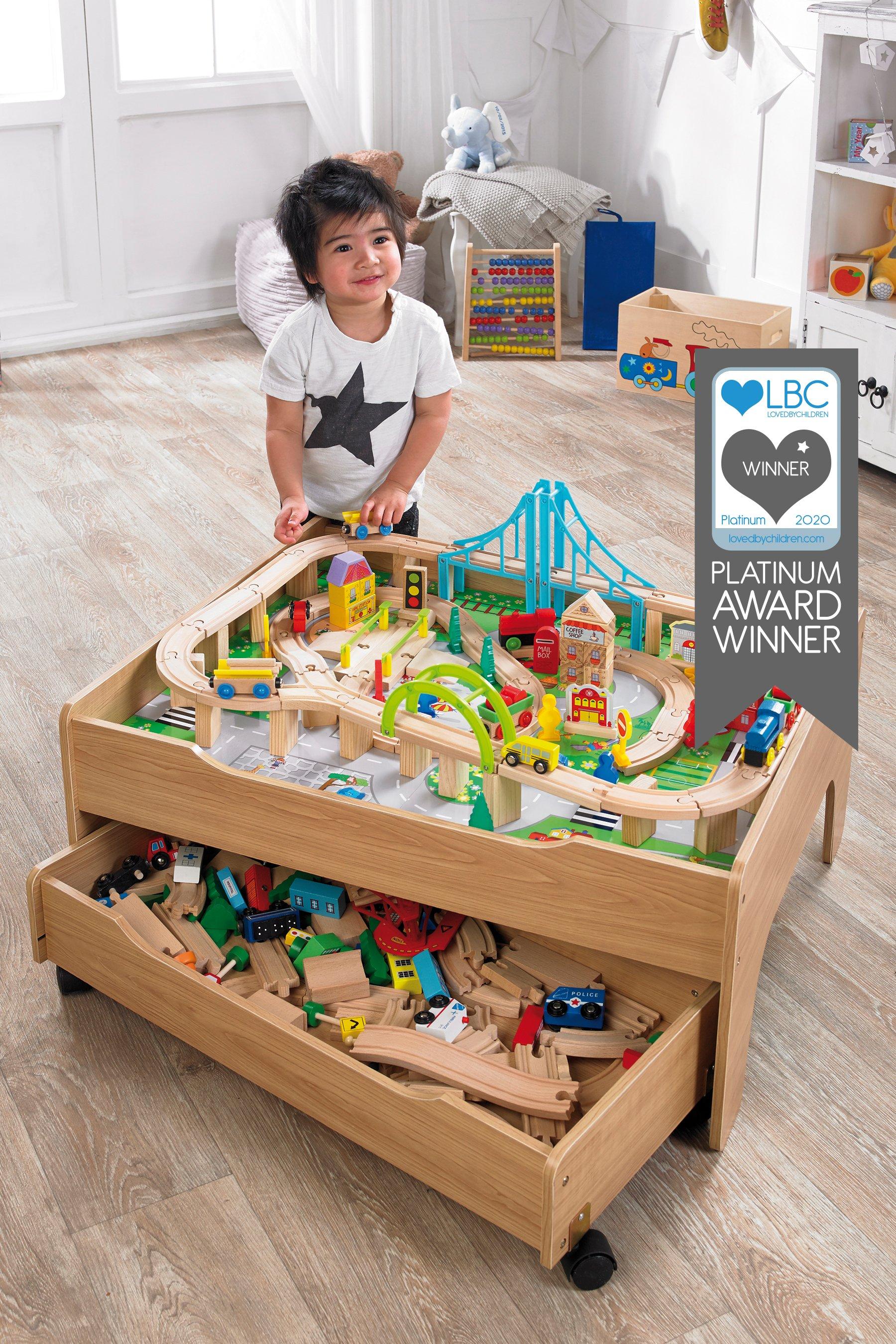 ( 4.5) out of 5 stars. Hape e3766 70 piece railway train table and set toy with battery powered locomotive with removable playmat surface and storage for kids 3 years and up. Tuck this train table away in the corner of the room and use shallow bins to store extra toys underneath. Kidkraft railway express wooden train set & table with 79 pieces and two storage bins, gift for ages 3+ Little tikes real wooden train table set for kids, deluxe over 80 piece hand painted wooden set with tracks, trains & accessories for boys & girls made with real wood, this durable table and train set is large enough for more than one child to play together.